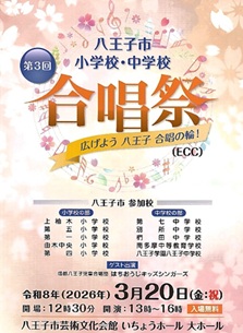 広げよう合唱の輪をテーマとして「第3回合唱祭」が3月20日13時より「八王子芸術文化会館いちょうホール大ホールにて開催されます。 出場していただける学校は、市内の小中学校11校の予定です。 特別出演として八王子児童合唱団「はちうおうじキッズシンガーズ」も出演されます。 皆さんで応援しましょう!